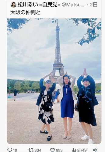きょうの大阪は強烈な暑さでした。救急車が走り回っていたのは、熱中症の患者さんお緊急搬送だったのかもしれません。 一方、わが大阪選出の松川るい参議員は、2日前のパリのエッフェル塔の前でご覧のポーズです。 「大阪の仲間と」ということですから、一緒…