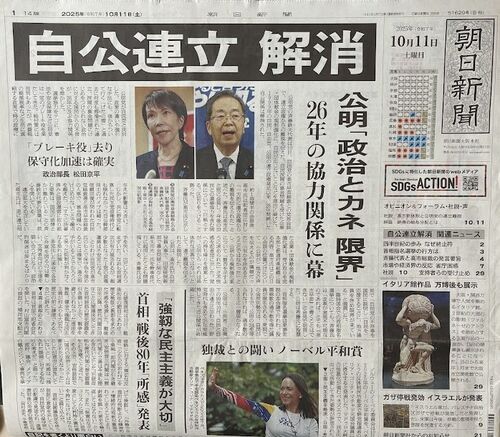今朝の朝日新聞一面は、歴史的なニュースでした。26年も連れ添った自民党と公明党が連立を解消しました。 公明党は、自民党の裏金体質を持ったままの元安倍派(萩生田など)を党幹部に起用したり、公明党のことを以前から嫌っていてバカにしている長老(麻生…